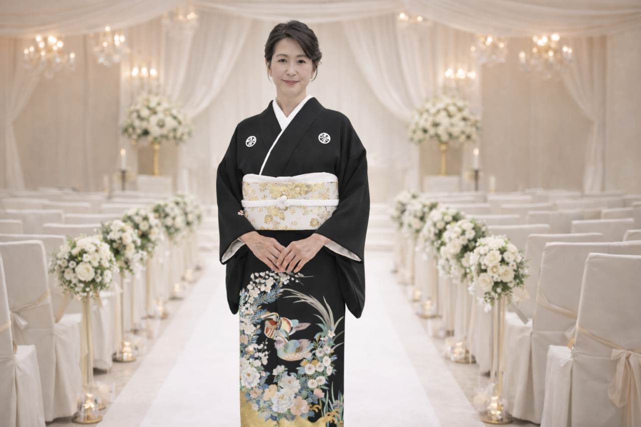 結婚式や披露宴で新郎新婦のお母様や親族がお召しになる黒留袖は、ゲストをおもてなしする最も格式の高い装いです。昔は、嫁入り道具の一つとして持たせることも珍しくありませんでしたが、保管場所の確保やお手入れにも手間がかかってしまうため、近年ではレンタルサービスを利用される方が増えています。裾部分のみに柄が入っていますので、身長や体形によって柄の出方が少しずつ変わるため、試着をして最も綺麗に柄が出るものをお選びいただくことをおすすめします。